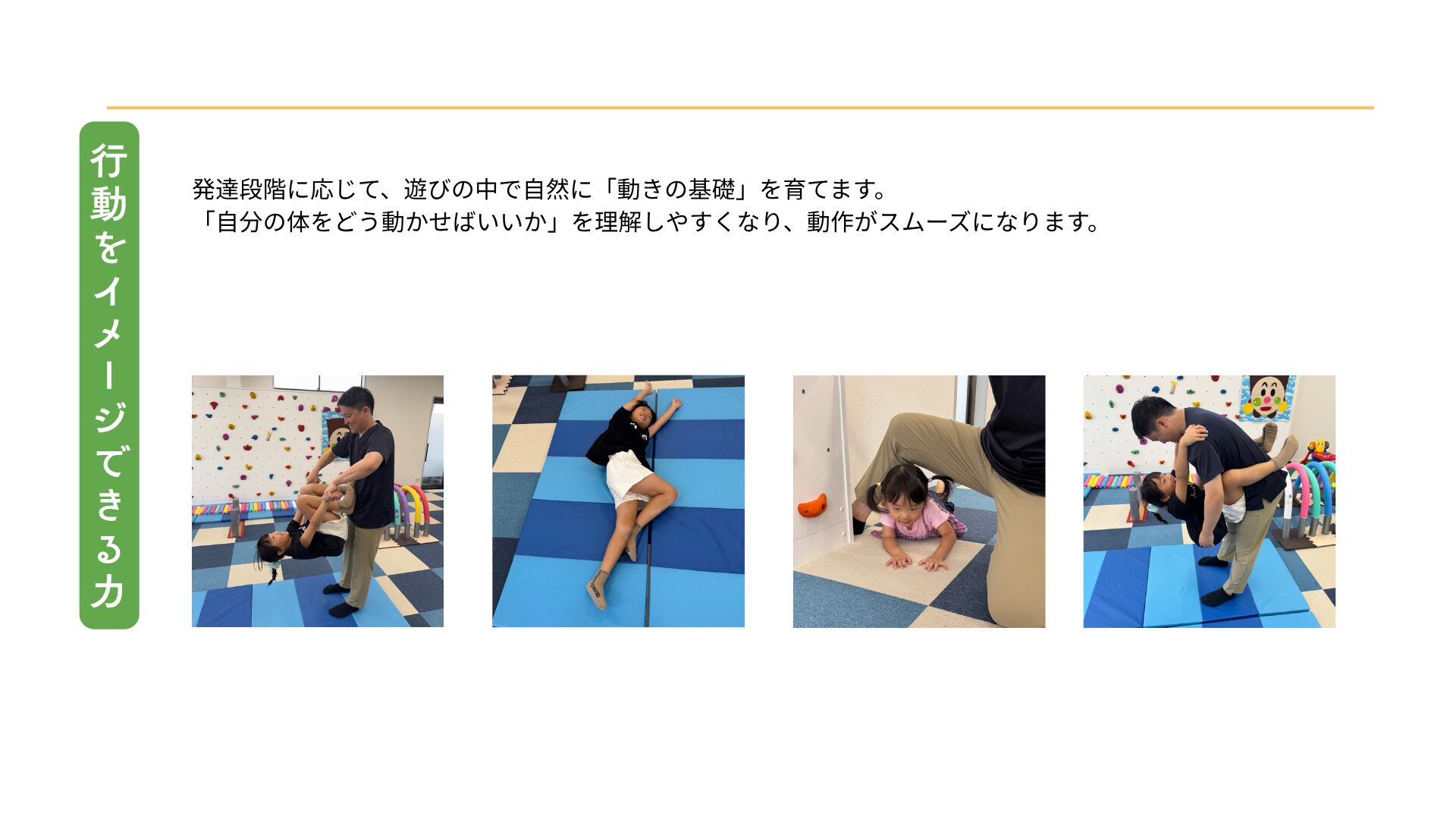 遊びを通しながら体の動かし方や姿勢・バランス感覚を育てていきます。